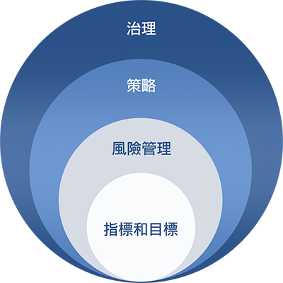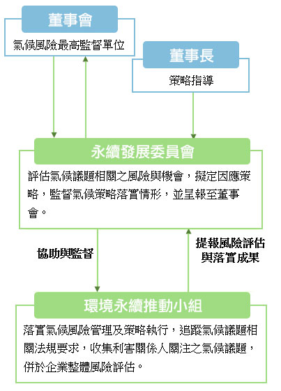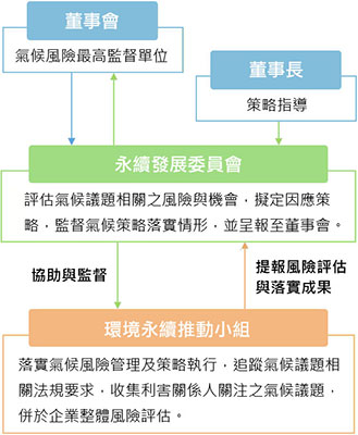 氣候風險管理及策略執行主要由永續發展委員會轄下之環境永續推動小組負責落實,由公司治理主管監督執行並匯總執行結果報告永續發展委員會,永續發展委員會覆核成果後,呈報至董事會。
