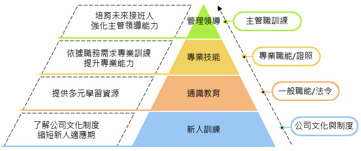 本公司為提升人力資源素質,提高員工工作效能及培養專業知識,訂定完善且具備系統性教育訓練制度,於年度蒐集訓練需求、編列訓練計畫及經費,依據不同職務及職涯發展需求,提供多元學習管道,不定期舉辦內部培訓或派外參加訓練課程,內容涵蓋管理領導、專業技能、通識教育、新人訓練,積極培育內部人才,滿足組織成長需求。