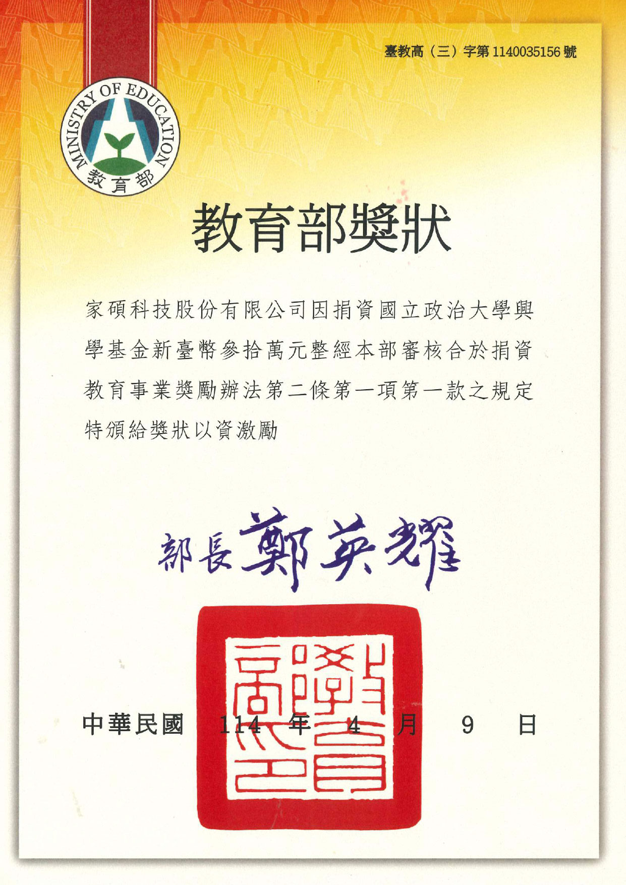 為使學生和教職員有更好的學習與交流空間,家碩科技捐贈30萬予國立政治大學,作為新教學大樓會議椅的購置經費,讓學生與教職員擁有更完善的學習與交流環境。