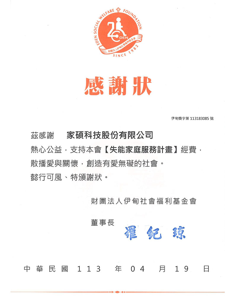 社會中仍有許多人在困境中努力前行,伊甸基金會長期為身心障礙者及弱勢家庭爭取權益、提供全人關懷。家碩科技自2021年起,每月固定捐款予伊甸基金會,由伊甸統籌,用於弱勢兒童、弱勢社區、老人服務、成人身障、失能家庭等多項援助,盼讓幫助被靈活地送達最需要的角落。